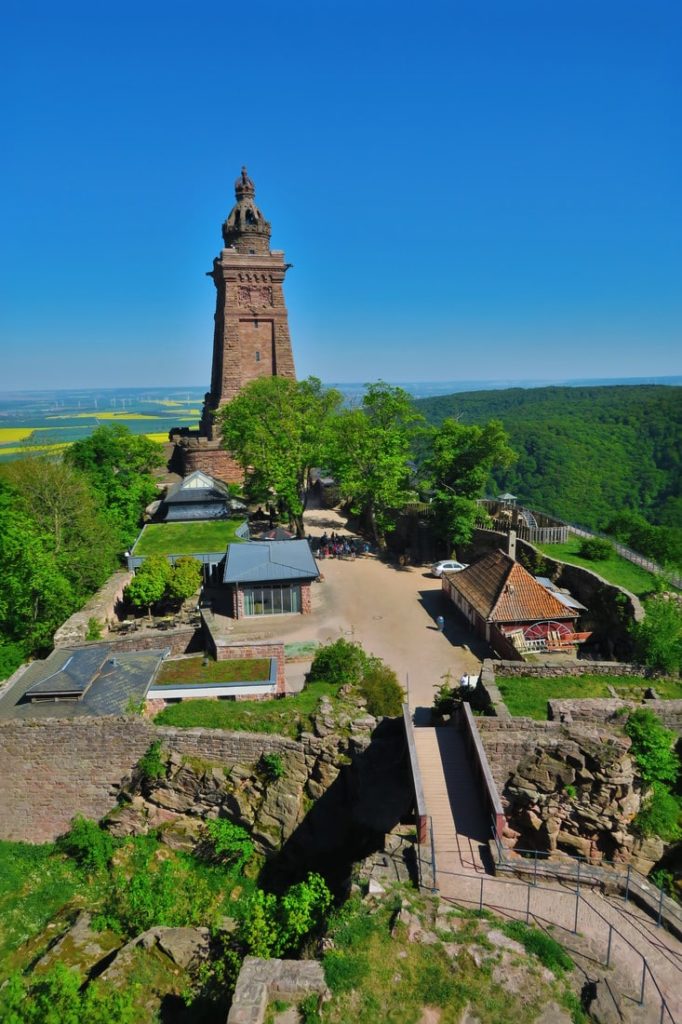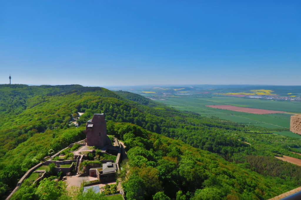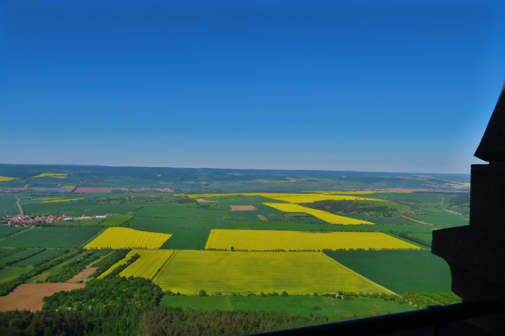 Oben angekommen besuche ich das Kyffhäuser Nationaldenkmal von Kaiser Wilhelm I – lesen mich in die Geschichte des Denkmals ein- wie immer in Kriegszeiten verherrlicht, zu DDR Zeiten vergessen und danach wieder restauriert. Ich genieße den 60 km Weitblick über die in voller Bracht stehenden gelben Rapsfelder bis hin zum Brocken und seinen Hexentanzplätzen, denen ich heute noch nachspüren will.